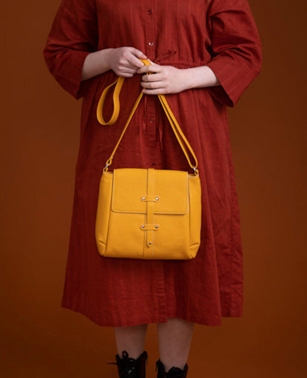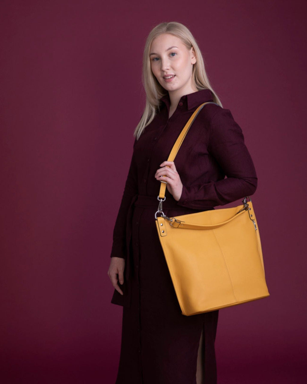 Muotituotteena se viestii itsevarmuutta ja luovuutta, ja sen valitsevat usein ne, jotka eivät pelkää kokeilla – yhdistelmä mustan, valkoisen tai harmaan kanssa pitää ilmeen tyylikkäänä, kun taas rohkeampien sävyjen sekoittaminen osoittaa eklektisempää, riskiä ottavaa tyyliä. Yhdistelitpä sitten keltaista nahkalaukkua tyyliisi miten tahansa, se on varmasti katseita keräävä asuste.