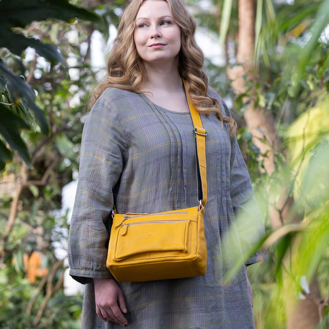 Skoga keltainen nahkalaukku on yllättävän tilava ja sinne mahtuvat välttämättömät tavarat, kuten puhelin, lompakko ja meikit. Sen kirjekuorimaisen läpän magneettineppari, kestävä tekstiilivuori ja sisäiset vetoketjulliset taskut takaavat käytännöllisyyden.