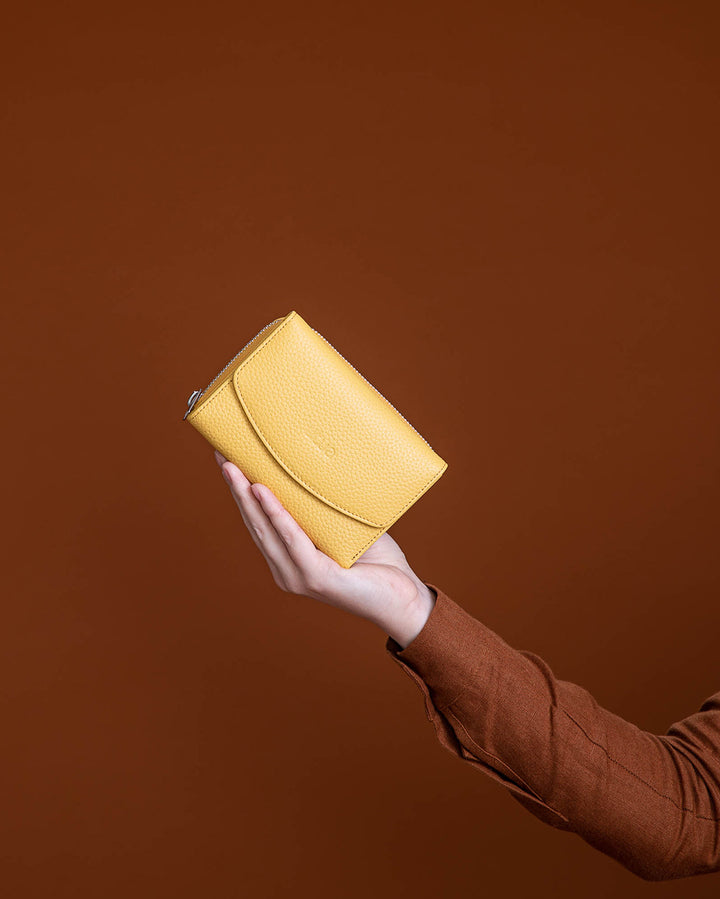 Näppärän kokoinen Kätkö-lompakko on valmistettu upeasta pintanahasta ja kuuluu Exclusive-mallistoomme. Kätkö sulkee sisäänsä paljon tärkeitä asioita, vaikka on mitoiltaan kompaktin kokoinen. Etupuolelta löytyy painonapin alta useita käytännöllisiä kortti- ja setelitaskuja. Kätkössä on myös vetoketjullinen tasku, jonka sisäpuolelta löytyy vielä erillinen, pienempi vetoketjutasku kolikoille. Ja miten helppoa on tämä oranssi lompakko löytää laukun uumenista!