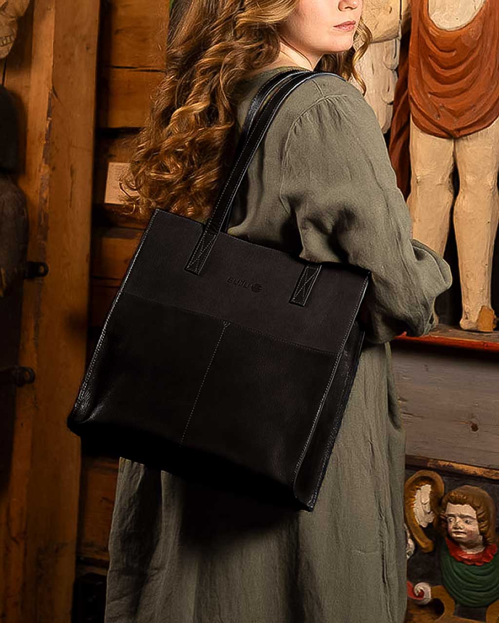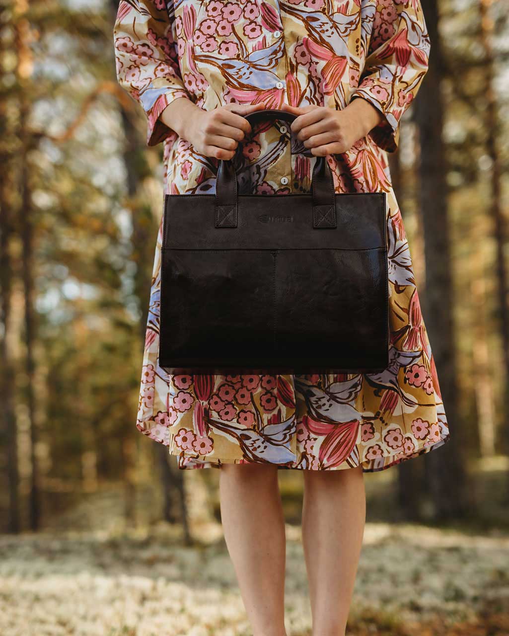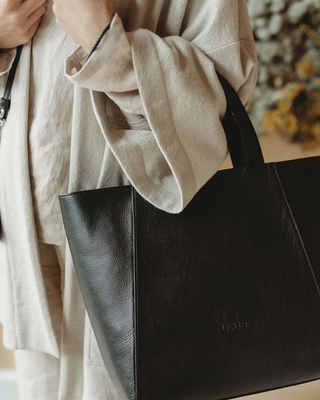 Utuan Hermione Exclusive -tote laukku mustasta kasviparkitusta nahasta on upea esimerkki skandinaavisesta minimalismista ja ympäristötietoisesta ylellisyydestä. Tämä laukku yhdistää ajattoman eleganssin ja toiminnallisuuden, ja se on valmistettu korkealaatuisesta, kemikaalittomasta