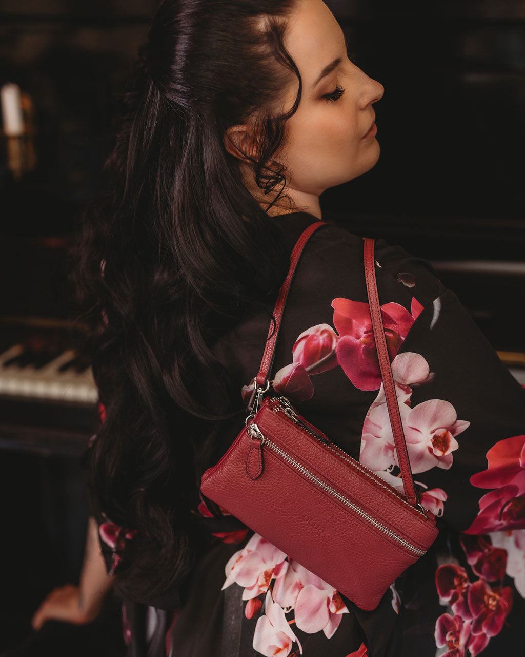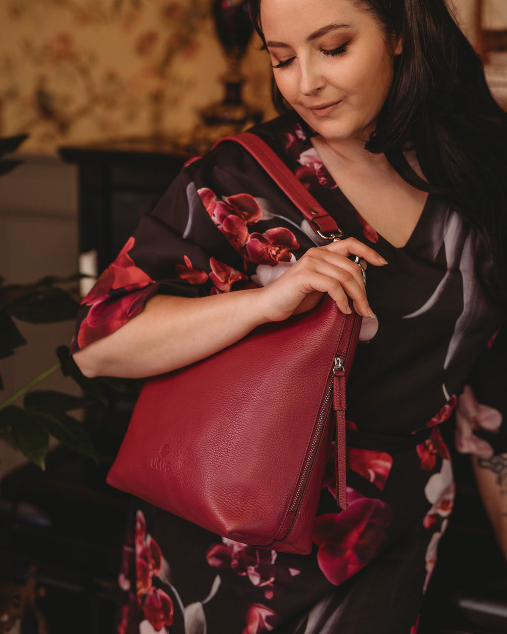 Punainen Aurora-käsilaukku on monipuolinen ja elegantti asuste, joka on valmistettu silkinpehmeästä nappanahkasta, joka on peräisin Italian Mastrotto-parkitsimosta. Tämä tilava nahkalaukku sopii pienelle kannettavalle tietokoneelle, lompakolle, puhelimelle ja muille tavaroille. Laukussa on vetoketjullinen tilanjakaja, kaksi avotaskua ja ulkoinen vetoketjullinen tasku tavaroiden järjestelyä varten. Laukun eloisa punainen sävy, kiinteä kantokahva ja kaksi irrotettavaa hihnaa tekevät siitä helposti muunneltavan sekä käsilaukuksi että olkalaukuksi. Aurora sopii erinomaisesti niin työhön kuin rentoonkin käyttöön. Laukun pystysuorat sivutikkaukset lisäävät hienovaraista tyylikkyyttä.