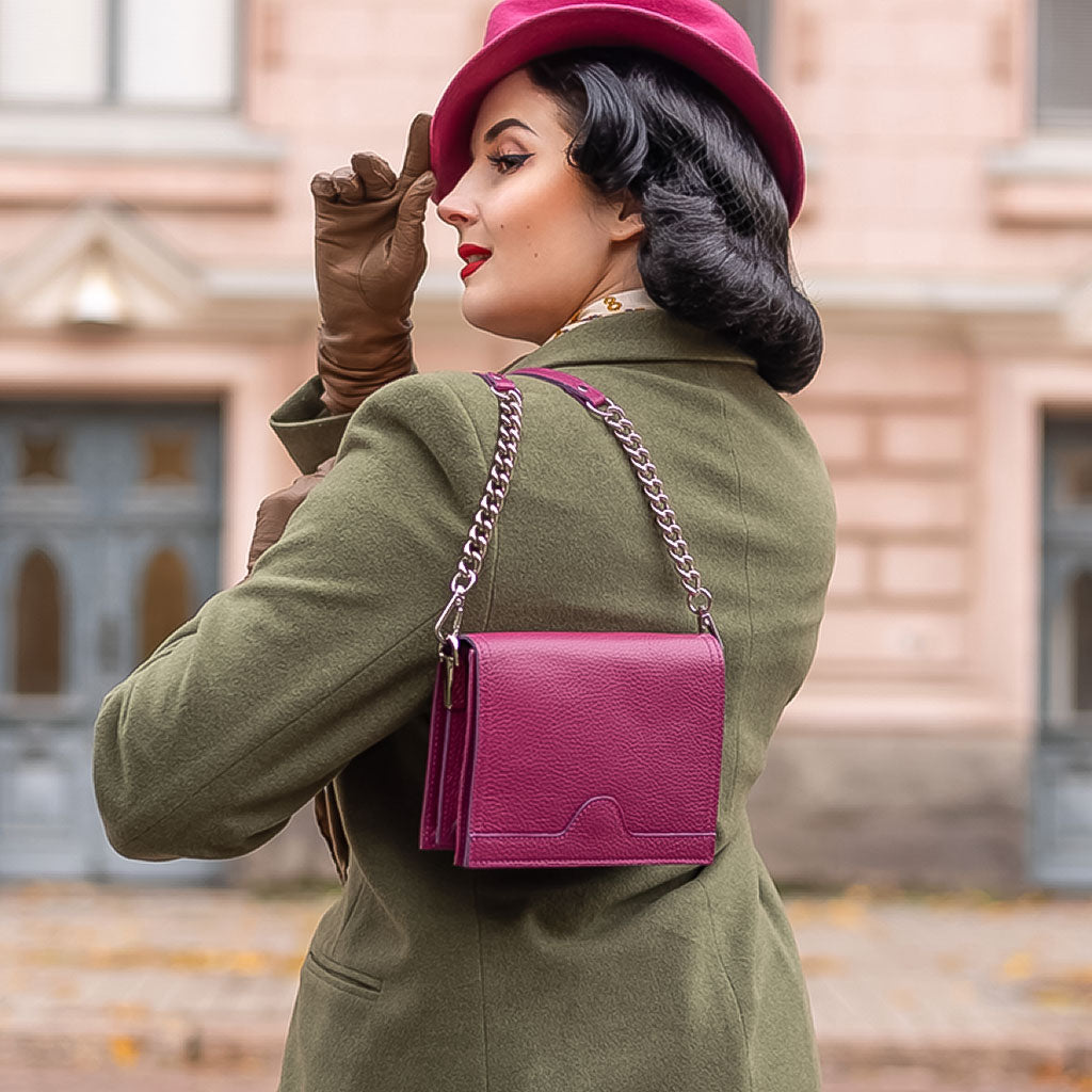 Daalianpunainen Utua Audrey -olkalaukku on siro ja elegantti asuste, joka on saanut inspiraationsa Audrey Hepburnin ajattomasta tyylistä. Se on kompakti mutta toimiva, ja siinä on magneettisuljentainen läppä, kestävä tekstiilivuori ja sisätaskut (kaksi avointa ja yksi vetoketjullinen) tärkeille tavaroille, kuten puhelimelle, huulipunalle ja avaimille. Säädettävä, irrotettava ketjuhihna lisää ripauksen glamouria, joten se sopii erinomaisesti sekä kaupunkiin että iltakäyttöön.