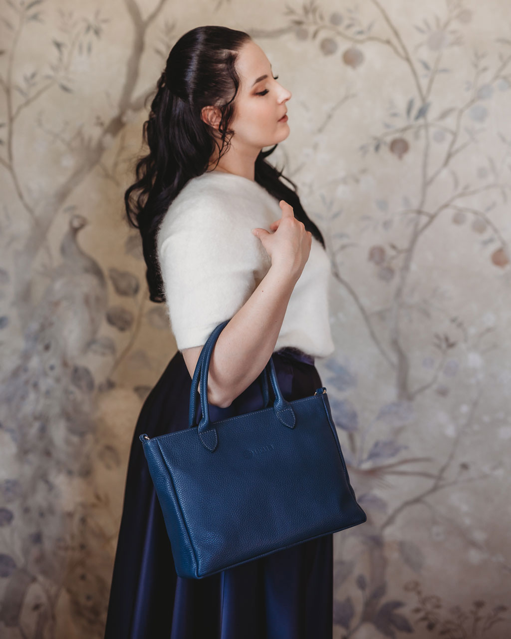 Selenen kahvat ja irrotettava olkahihna tarjoavat useita kantovaihtoehtoja – kädessä, kyynärpäällä tai olkapään yli. Sen rikas sininen sävy, joka symboloi luottamusta ja harmoniaa, korostaa sen tyylikästä, minimalistista muotoilua tehden siitä ylellisen mutta käytännöllisen asusteen.