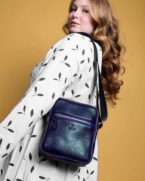Utuan Apollon Exclusive -pikkulaukku tummansinisestä kasviparkitusta bionahasta on suomalaisen muotoilun mestariteos, joka ilmentää ajatonta eleganssia ja toimivuutta. Se tarjoaa kompaktin mutta käytännöllisen muotoilun vetoketjulla, etutaskulla ja vetoketjullisella sisäosastolla – täydellinen paikka tärkeille tavaroille, kuten puhelimelle, lompakolle, avaimille ja jopa iPad minille kotelossa.