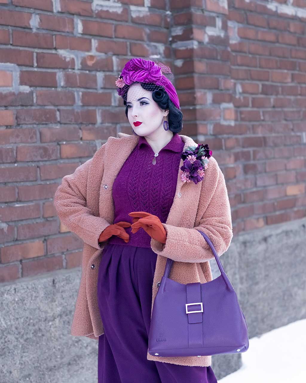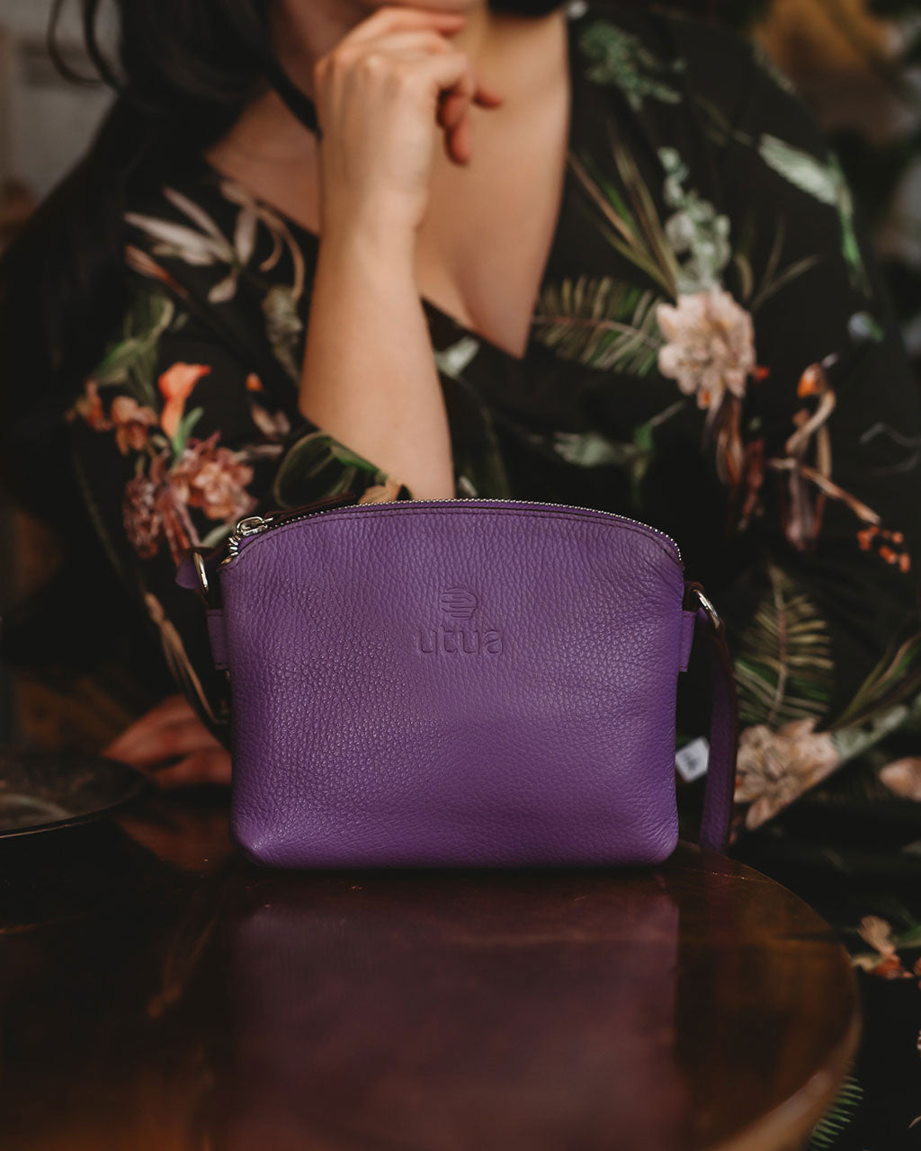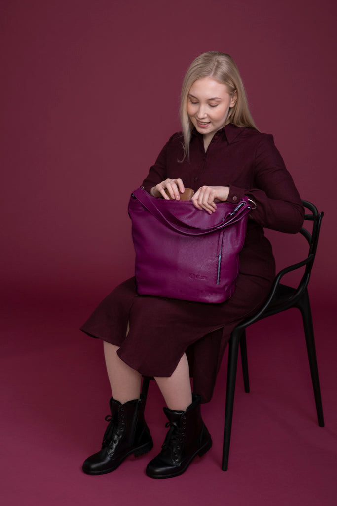 Utuan tummanvioletti Roihu nahkalaukku mukautuu saumattomasti ja on monipuolinen, tyylikäs asuste, joka heijastaa yksilöllisyyttä ja ajatonta käsityötaitoa.