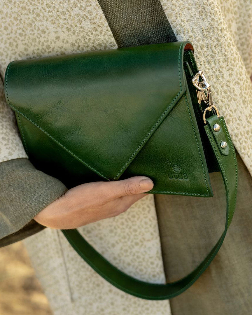 Ajattomasta ja tyylikkäästä vihreästä nahkalaukusta tulee sinulle pitkäaikainen kumppani. Kaikki Utua-nahkalaukut on valmistettu korkealaatuisesta nahasta pienessä ateljeessa Kreikassa ammattitaidolla. Suunnittelun