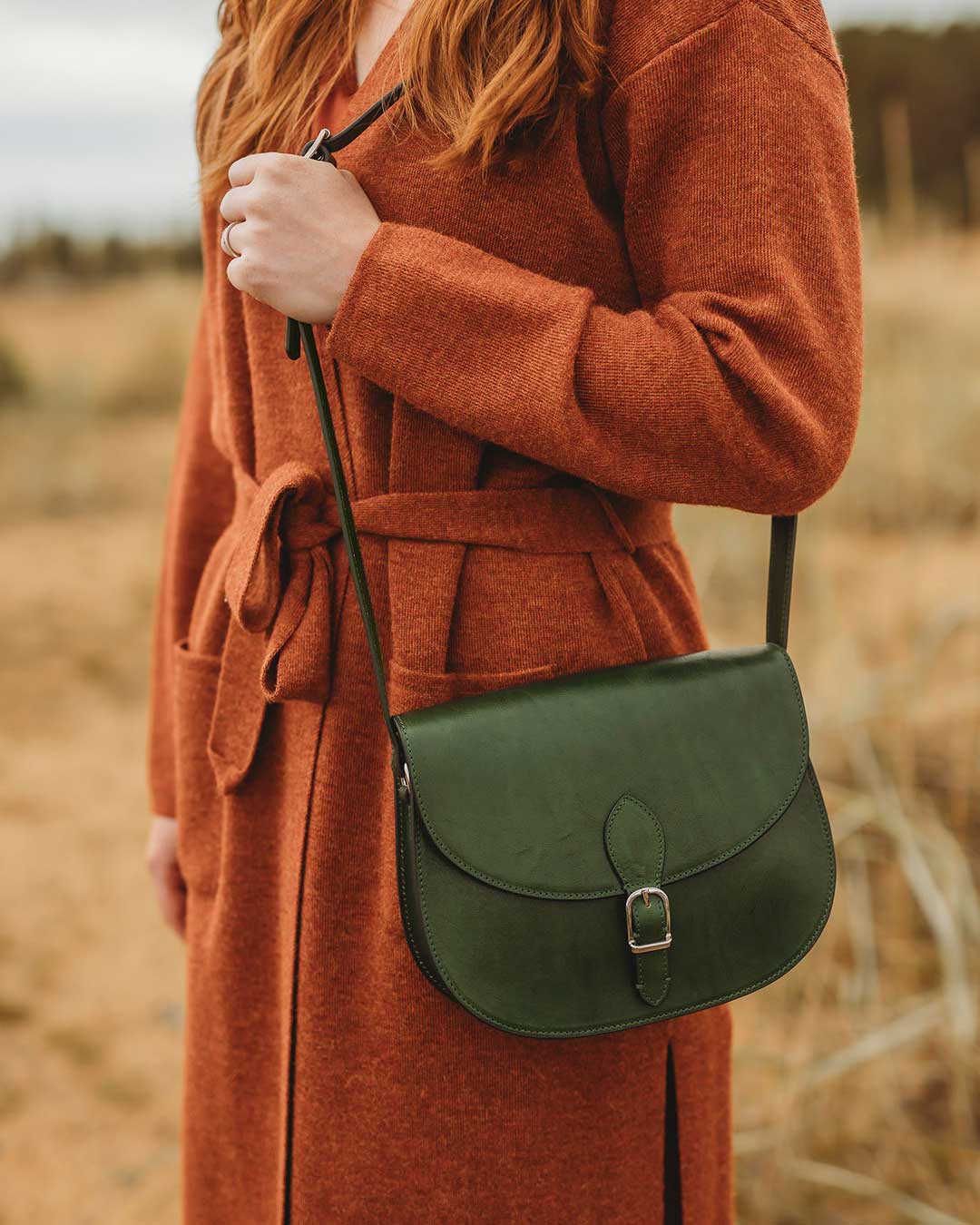 Oliivinvihreä tai metsänvihreä nahkainen olkalaukku sopii saumattomasti yhteen farkkujen ja raikkaan valkoisen t-paidan kanssa. Lisää ruskeat nahkasaappaat tai -lenkkarit tuomaan maanläheistä tunnelmaa ja heijastamaan itsevarmuutta.