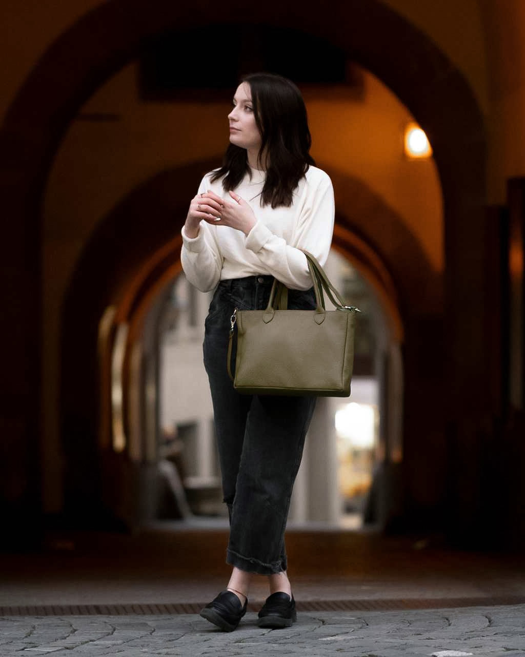Tyylikkään päiväasun luomiseksi yhdistä tummanvihreä nahkalaukku neutraaliin asuun – ajattele kermanvärisiä puseroita, beigejä housuja tai valkoista midimekkoa. Laukun rehevä sävy lisää väripilkun olematta liian hallitseva, ja se viestii hienostuneisuudesta ja ympäristötietoisuudesta.