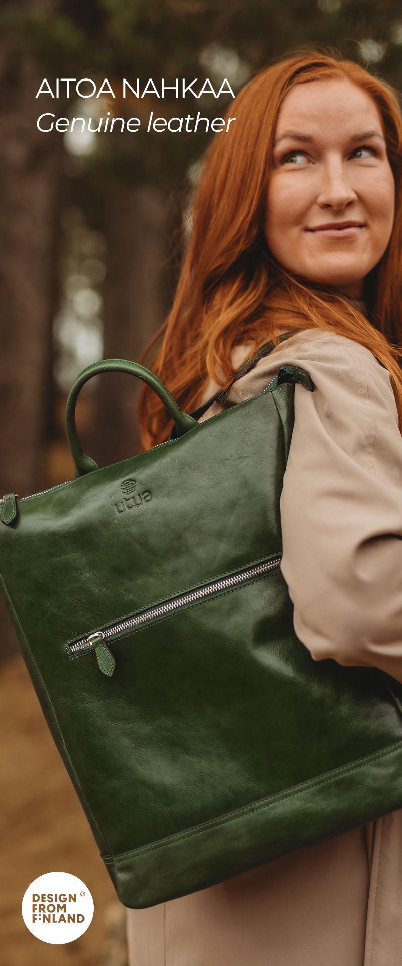 The high-quality surface of the Utua backpack blends into the look of a leather jacket or trench coat and goes beautifully with leather pumps or boots. You can pair the backpack with a phone case that you use during the workday, which also slips smoothly inside the backpack.