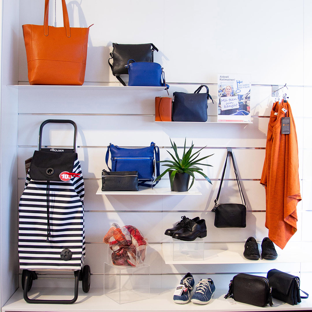 Sievi Shopissa myös Utua-nahkalaukut ja asusteet sekä näppärät Rolser-ostoskärryt.