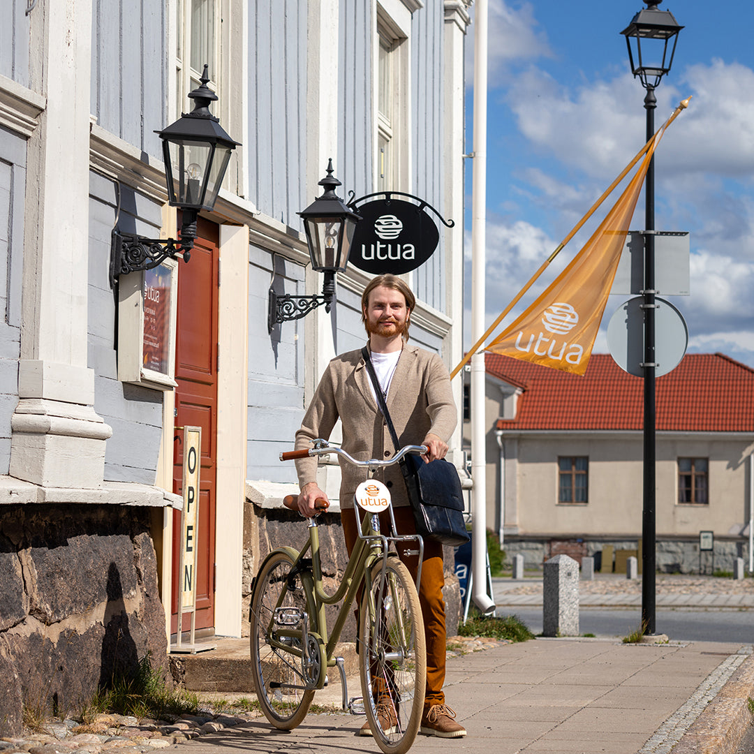 Utuan myymälä sijaitsee keskellä Wanhaa Raahea, Pekkatorin laidalla. 1800-luvun alussa rakennetussa talossa saavat kauniit nahkalaukkumme arvoisensa ympäristön.